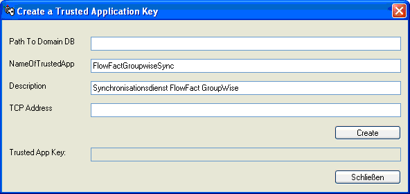 Wenn die Eingaben stimmen, wird nach dem Klick auf die Schaltfläche "Create" ein "Trusted Apllication Key" zurückgeliefert (andernfalls eine 2 oder leere Zeichenkette). Das Fenster darf erst geschlossen werden, wenn der Key kopiert wurde. Ansonsten gehen die Informationen verloren und es muss ein neuer Eintrag erstellt werden.