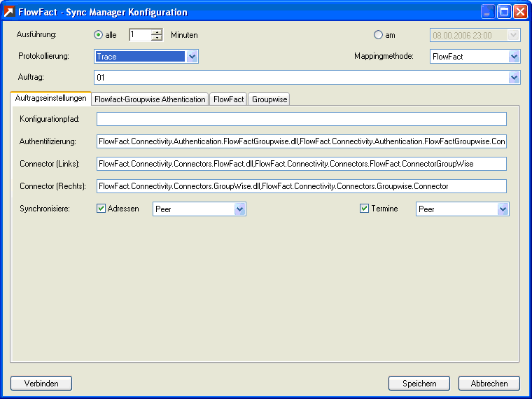 Nach einem Klick auf "Konfigurieren" erscheint die Konfigurationsdialog (Registerkarte "Auf-tragseinstellungen"), wie auf der folgenden Abbildung 3 gezeigt. Die drei ersten Einträge sind in der Regel irrelevant. Dort stehen nur die Namen der Bibliotheken, Klassen und der Konfigu-rationspfad. Ist das Feld des Konfigurationspfades leer, befindet er sich im gleichen Pfad wie die "FlowFactSyncService.exe".
