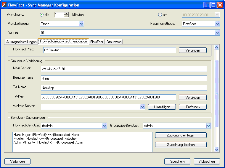 Damit die Synchronisation durchgeführt werden kann, muss jeder FlowFact Benutzer den ent-sprechenden GroupWise Benutzern zugeordnet werden. Dies geschieht, nachdem der Benut-zer jeweils in der GroupWise- und FlowFactbenutzerliste ausgewählt hat und per Klick auf die Schaltfläche "Zuordnung speichern" bestätigt wurde. Die Synchronisation der Benutzer findet in der gleichen Reihenfolge statt, wie sie in der Zuordnungsliste angezeigt werden.