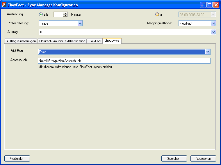 Die folgende Abbildung zeigt die Registerkarte "Groupwise". Die Auswahl "True" im Listenfeld "First Run" kann dazu verwendet werden, um ein komplettes System Adressbuch mit FlowFact unter dem Merkmal "GroupWise" zu synchronisieren.